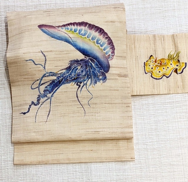 菜乃花さんの型絵染で 大好きなカツオノエボシ(クラゲ)と ウミウシ を染めて貰った 麻地の名古屋帯です。 麻でも透けないので単衣からお召頂けます。 これを型で作ってしまうのって・・・描いた方が絶対早いです。 この透明感も美しい染め上がり。 全長は377センチです。