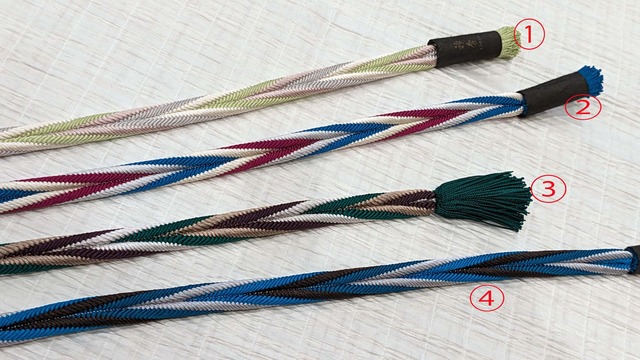 房が サッカーボールのような形になっている細目の帯締めです。 ブルーグレーの方は 片側に水玉状にポツポツとパステルカラーが組み込まれています。 赤黒はリバーシブル
