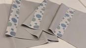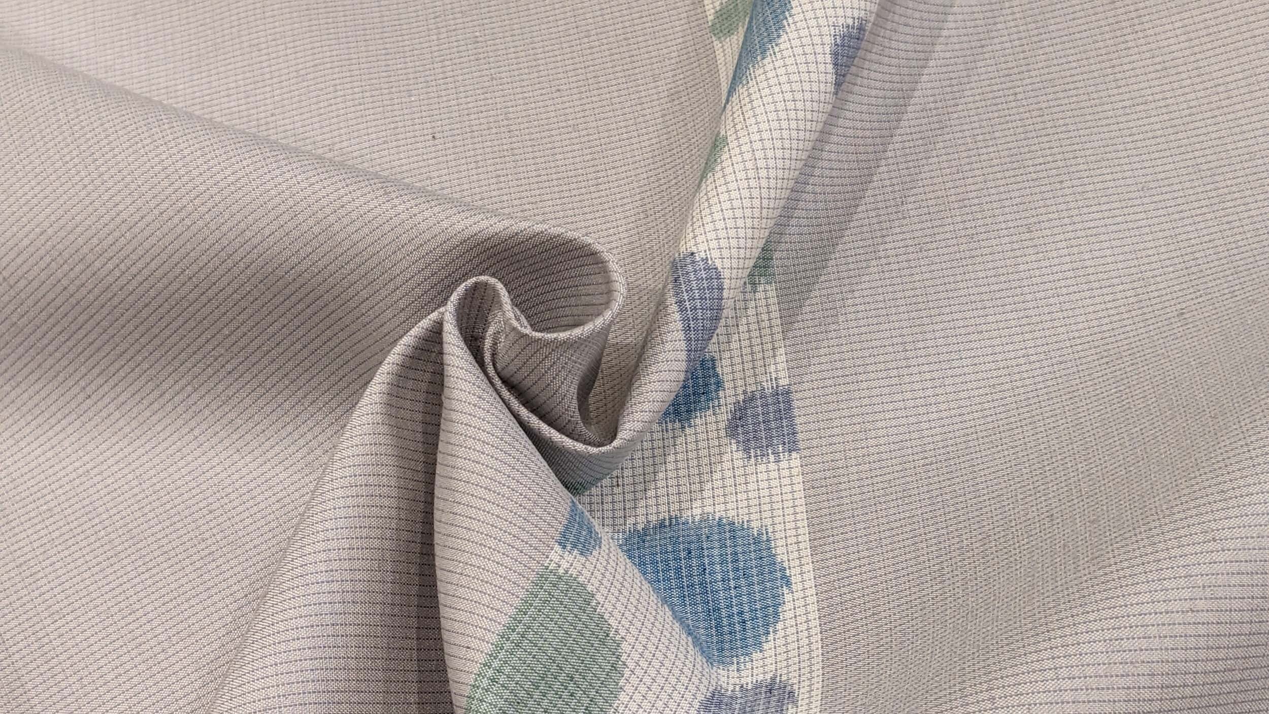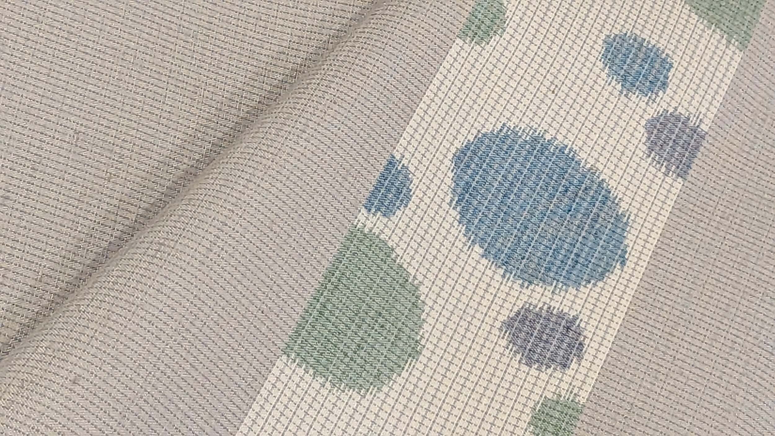 グレーのみじん格子と白地の段の中に大小さまざまな水玉を織り込んだ紬です。