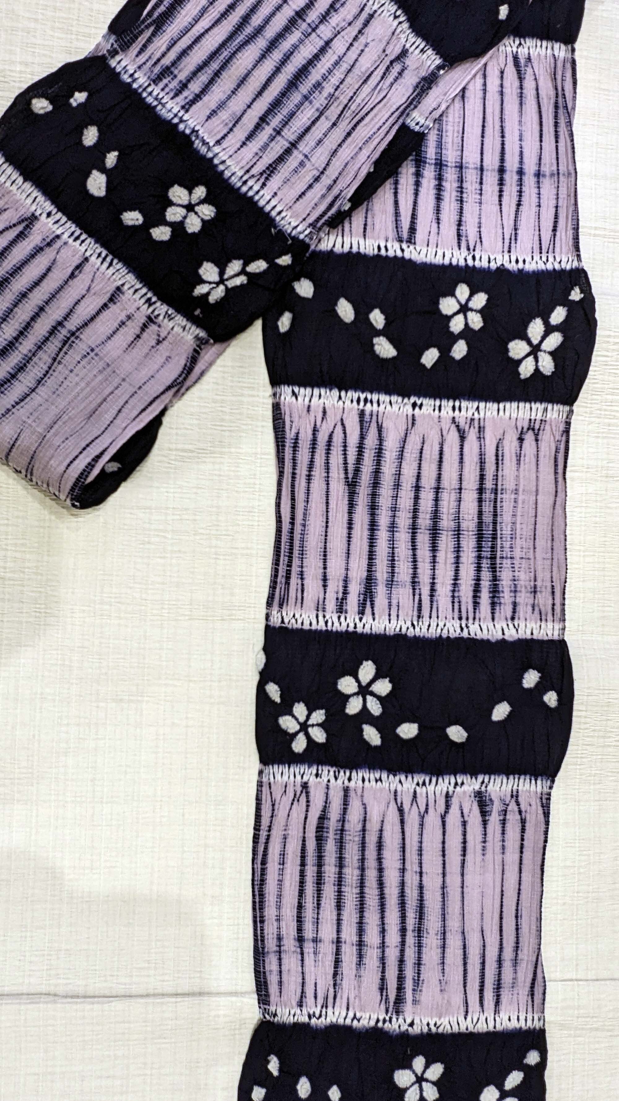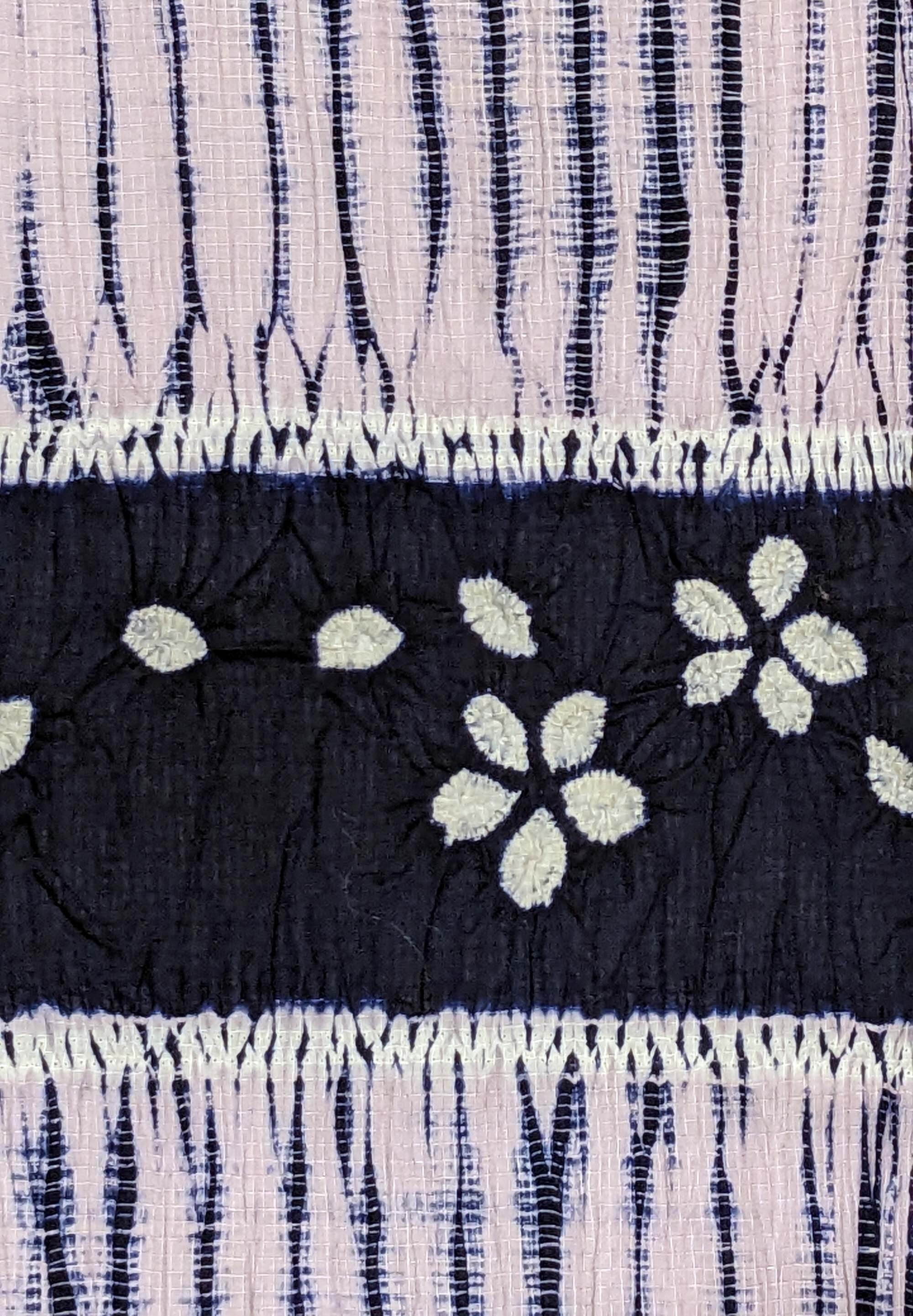 小帽子絞りで桜を。竜巻絞りで川をイメージして絞り染めにした浴衣。