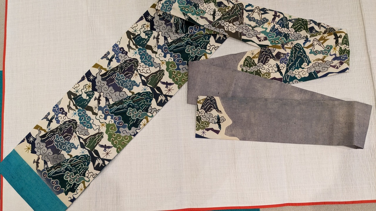 紬地に シルク博物館で入選した「循環」と同じ型を使って染めました。