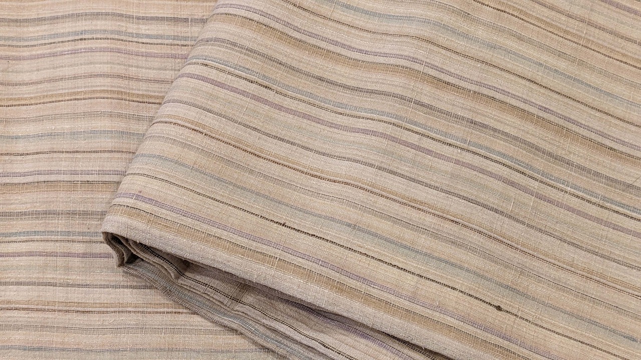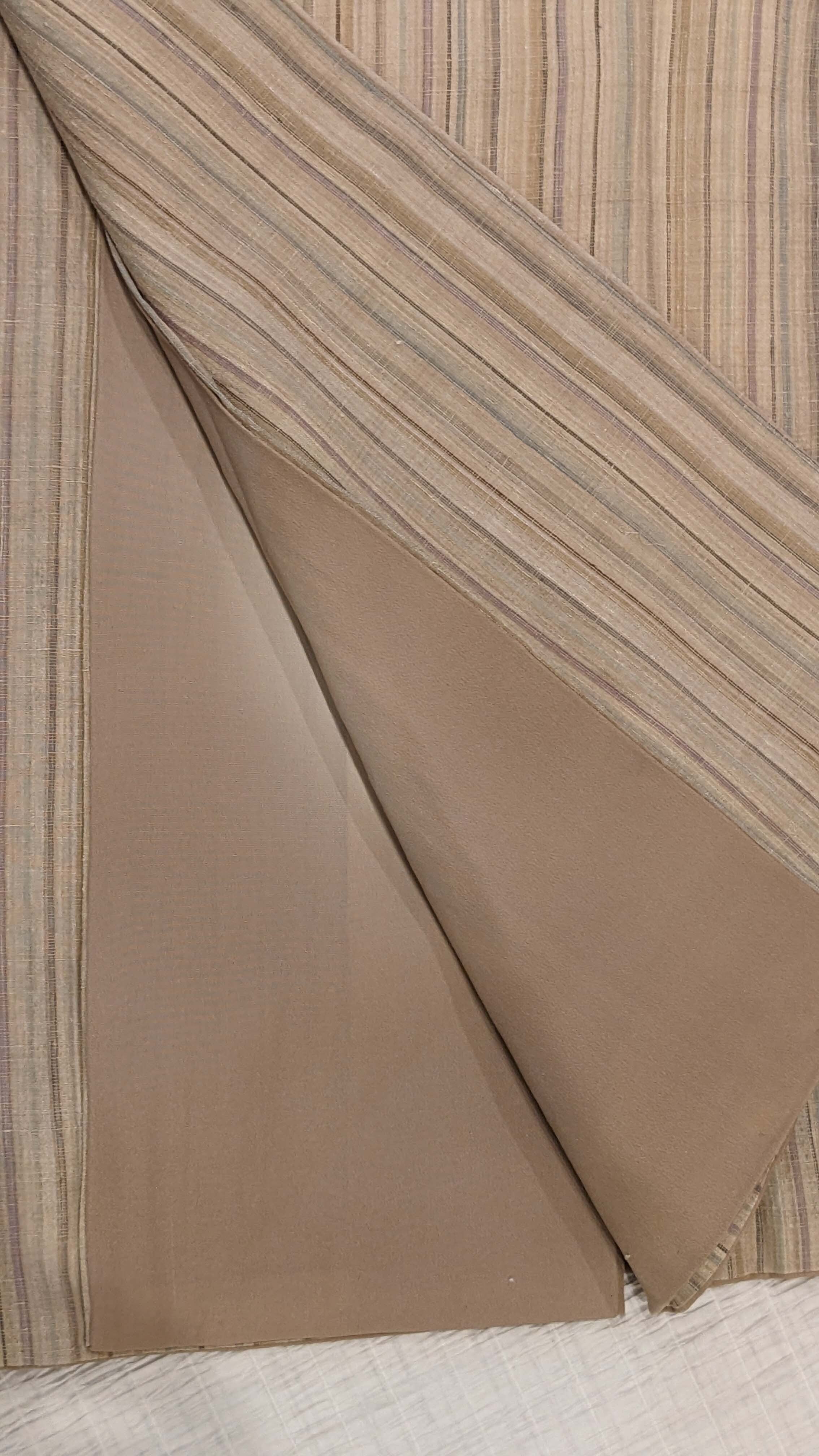 柔らかな色合いの薄茶濃淡の縞の結城縮。袷仕立てです。