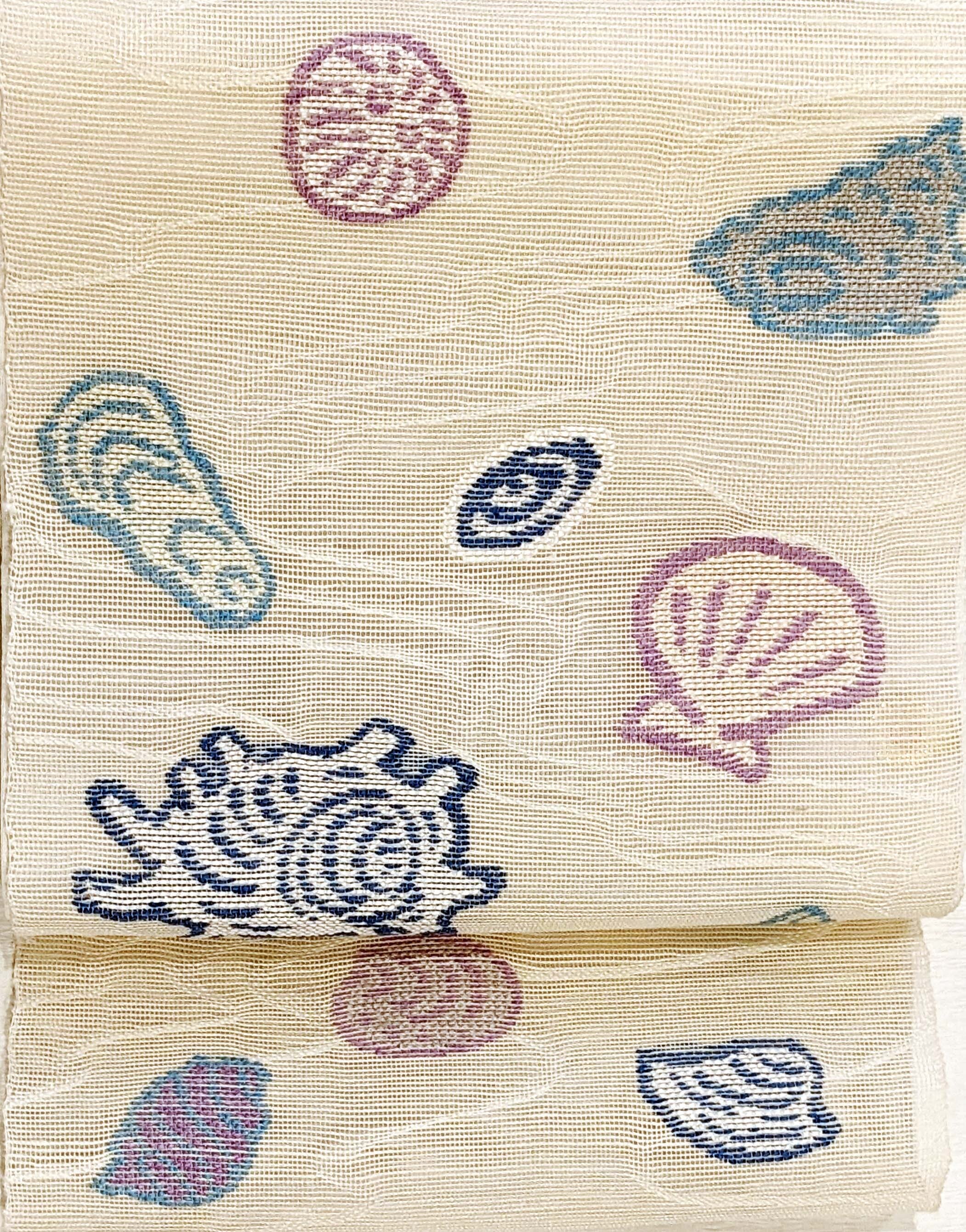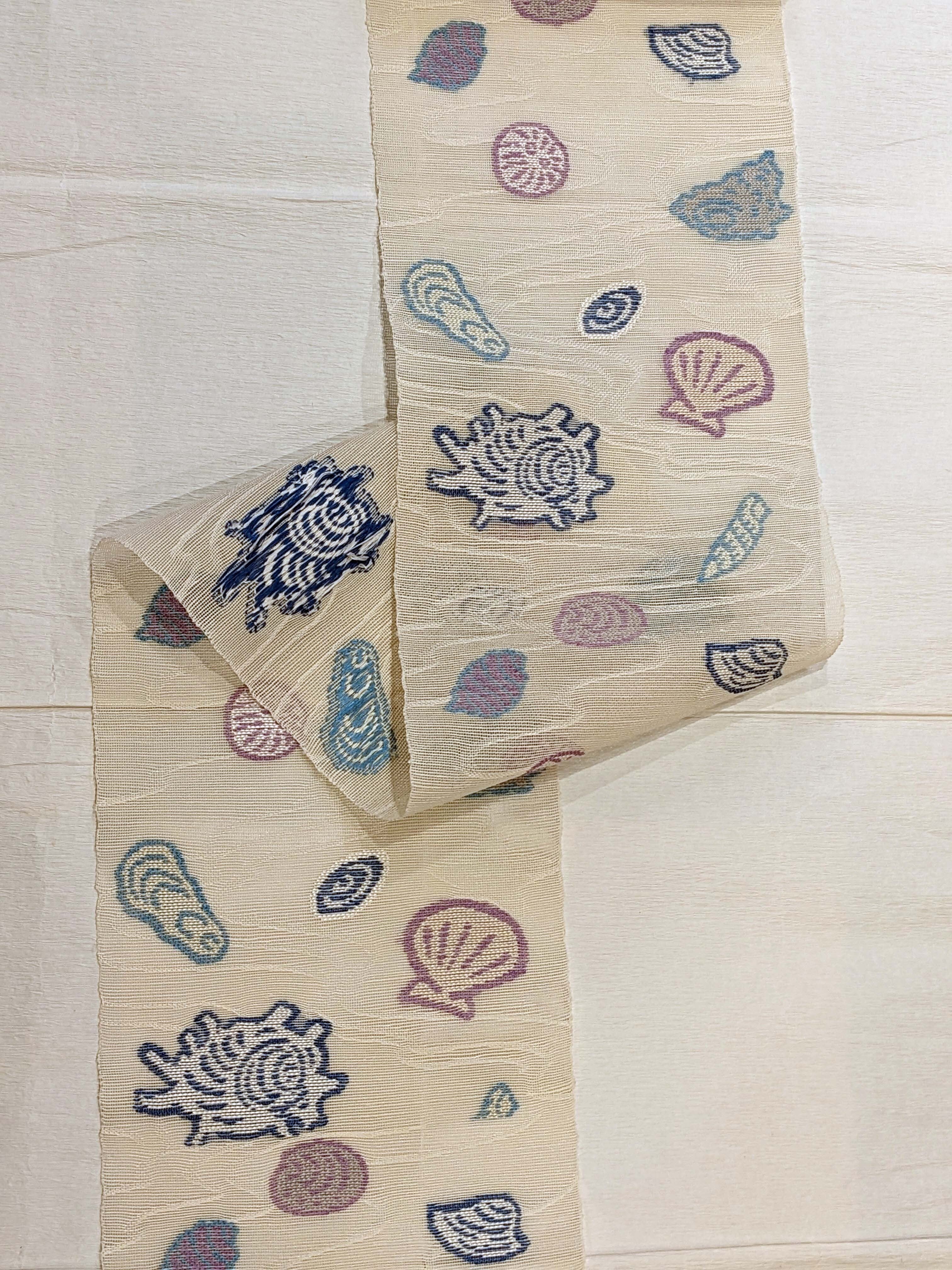 生成り地には流水文様が流れ 様々な貝が楽し気に並びます。