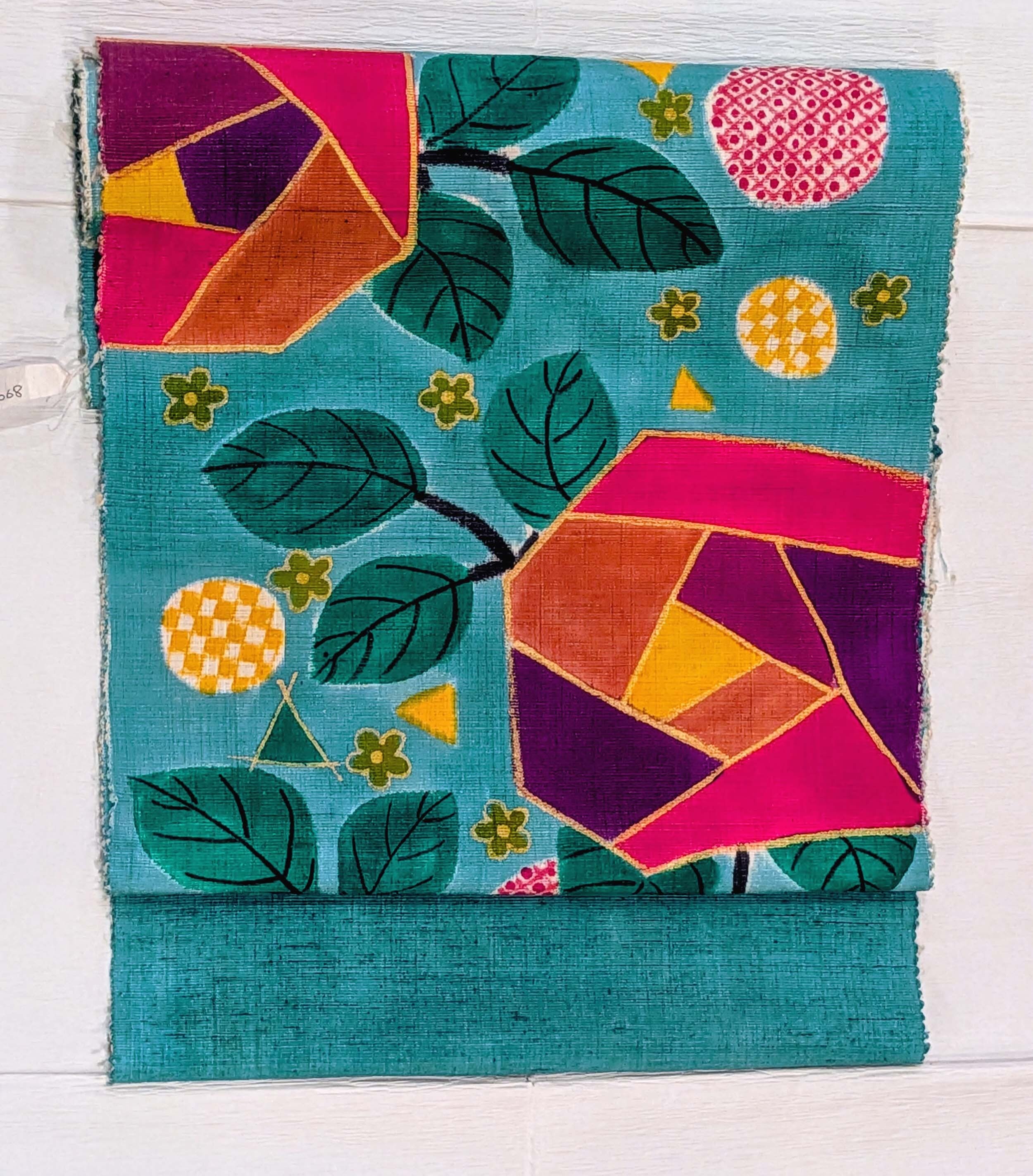 迫力のある大きな薔薇と 書き疋田や格子の丸がアクセント。