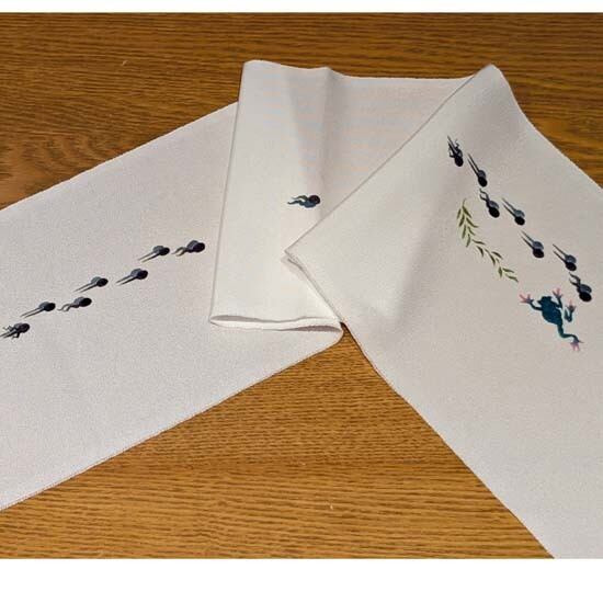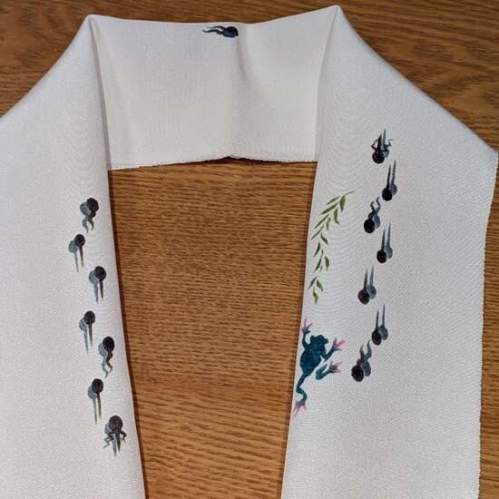 菜乃花さんの型絵染半衿 塩瀬地にカエルとオタマジャクシです。